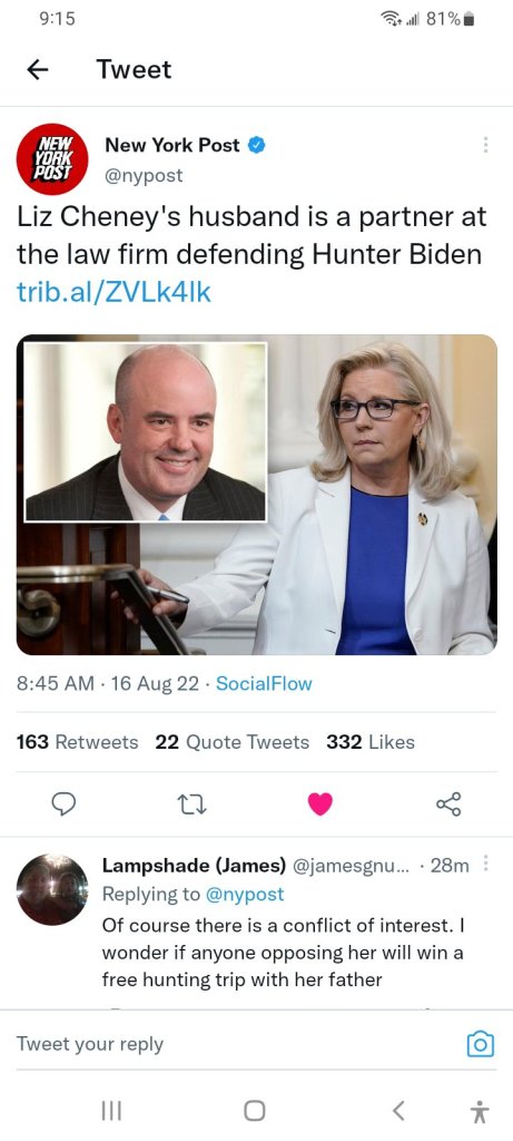 Liz Cheney's husband is a partner at the law firm defending Hunter Biden https://t.co/AnTRzOjmoq pic.twitter.com/fVsZ0lzxam